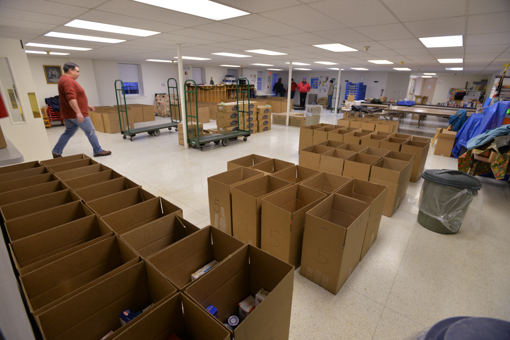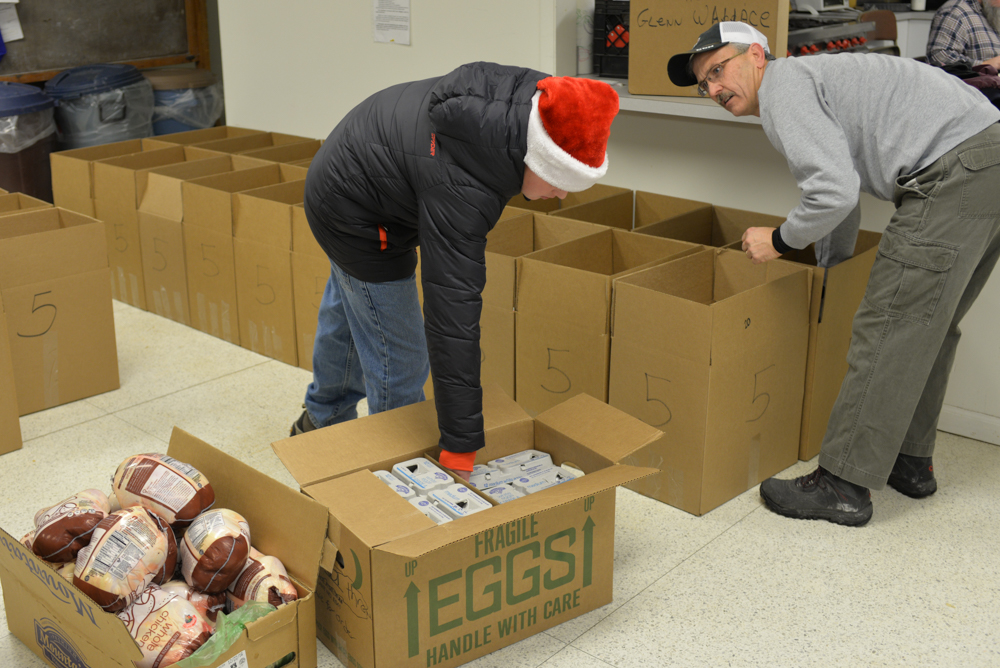 Early Saturday morning, fresh milk, fresh eggs, and frozen chickens donated by Hannafords were delivered (truck and driver kindly provided by Mario's). These were unloaded and distributed among the many boxes destined for needy families in the area.