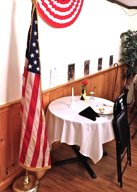 A table was set in honor of missing veterans. The message on the wall behind the table reads as follows: